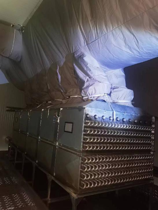 2、高溫庫,選用2套萊富康3臺190匹高溫螺桿機組,6臺DJ-2000落地式冷風機,2臺2800KW蒸發式冷凝器,自動水沖霜,配備布袋風道,采用峰平谷運行模式。